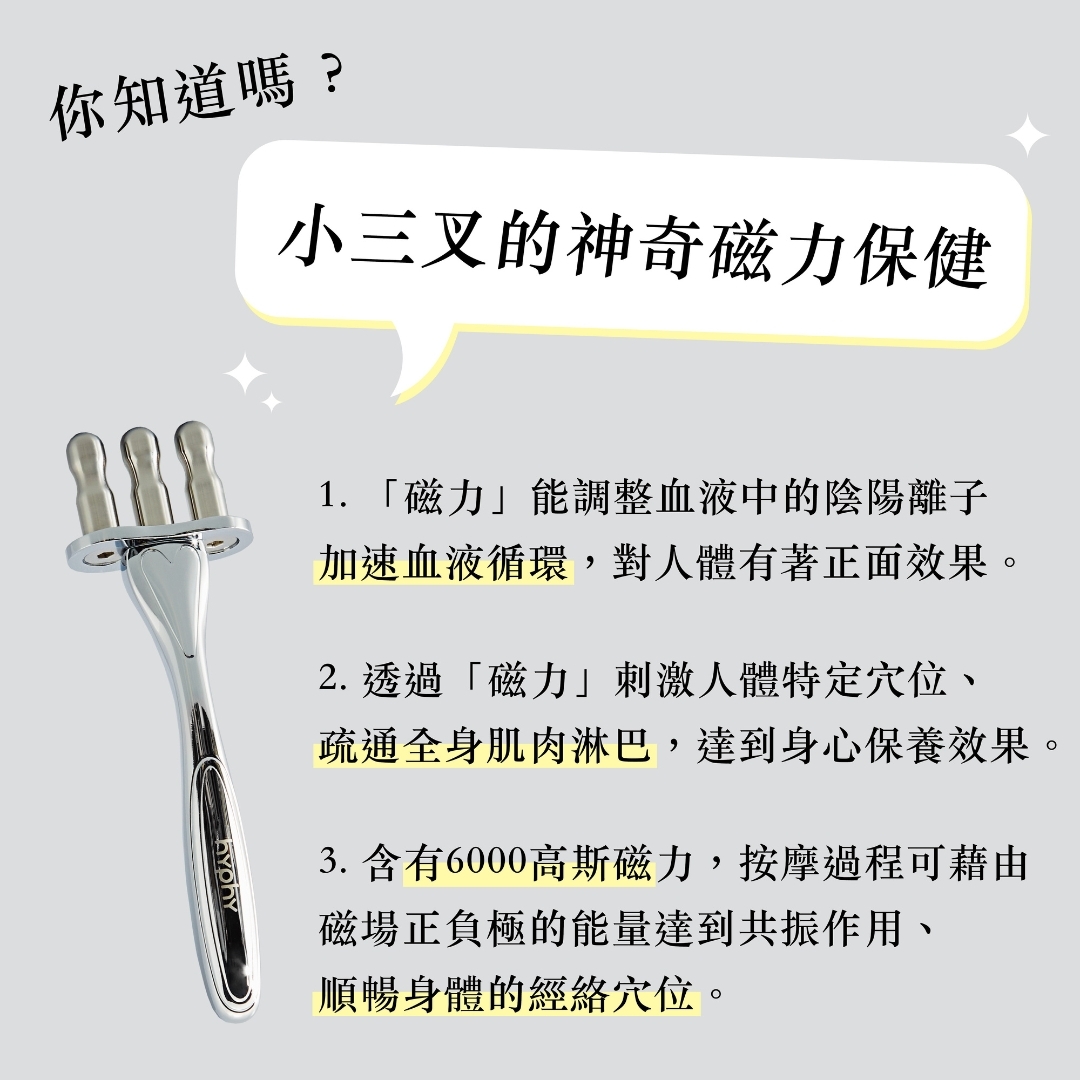 近年來「磁力保健」風潮盛行,這是自古代流傳至今的保養利器。「磁力」據傳能調整血液中的陰陽離子加速血液循環,對人體有著正面效果。透過磁力刺激人體特定穴位能更加疏通全身肌肉淋巴而達到身心保養效果。
