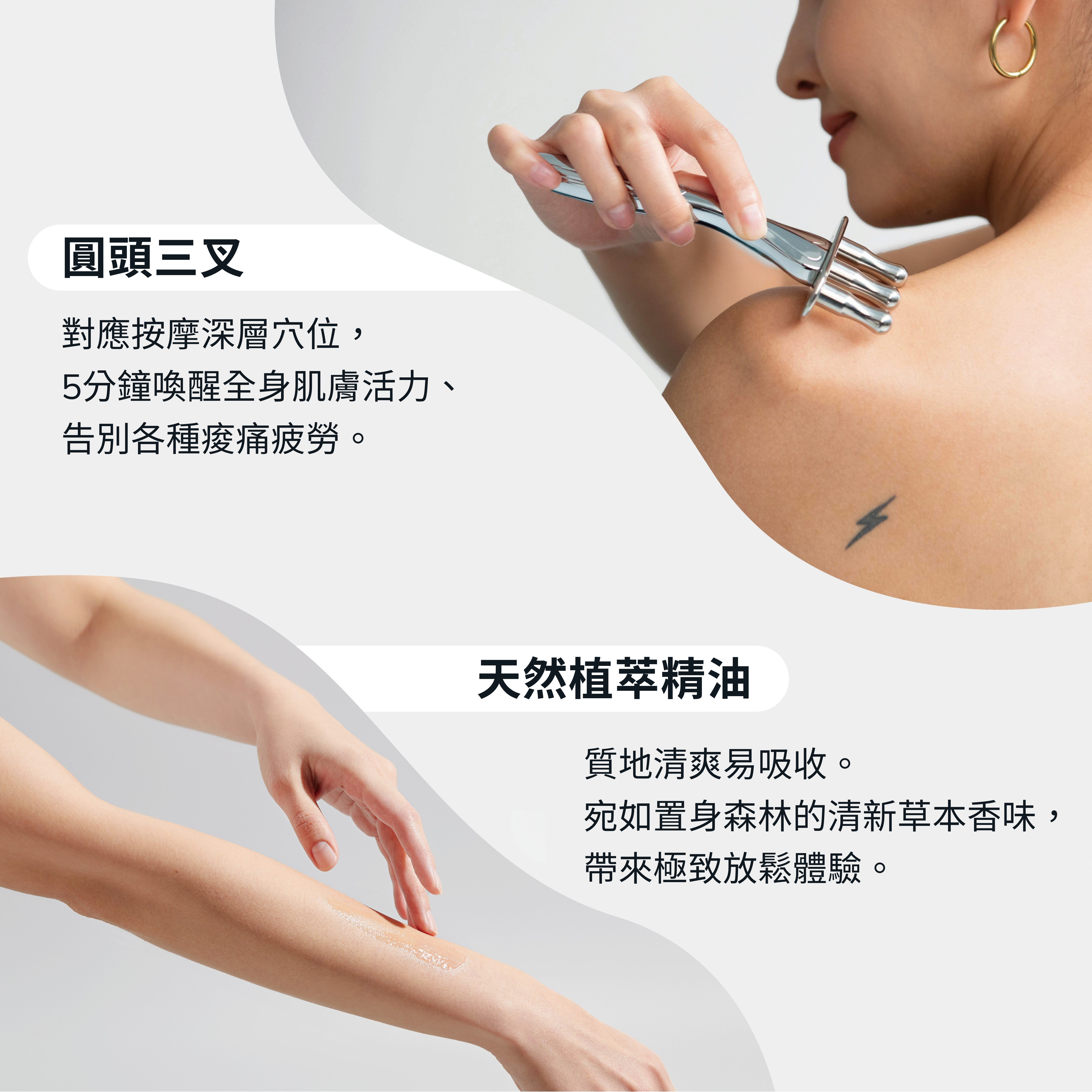 三叉前端的圓頭設計,讓按壓過程不怕刮傷,能更有效按壓刺激穴道,方便提拉、點壓,達到最佳按摩效果,喚醒疲憊的表層及深層肌。