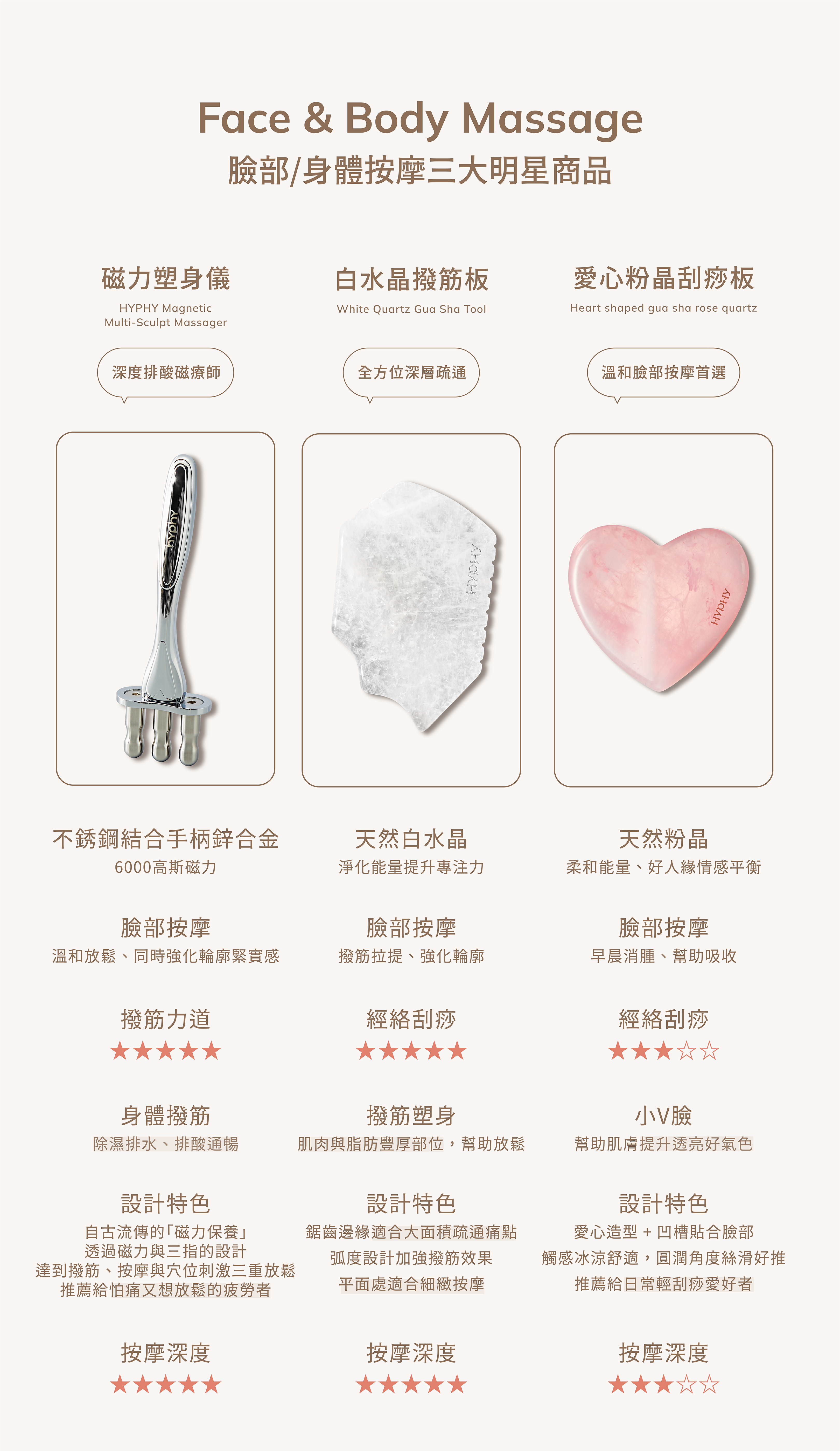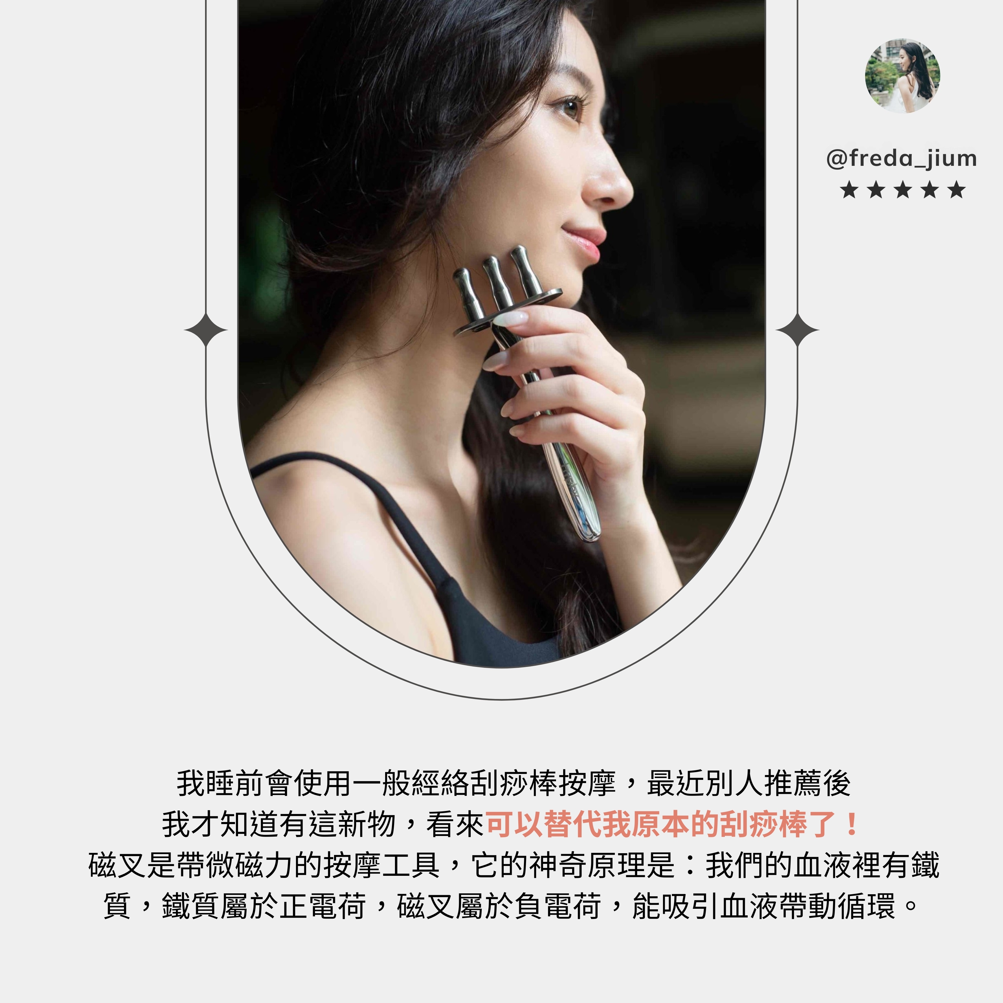 近年來「磁力保健」風潮盛行,這是自古代流傳至今的保養利器。「磁力」據傳能調整血液中的陰陽離子加速血液循環,對人體有著正面效果。透過磁力刺激人體特定穴位能更加疏通全身肌肉淋巴而達到身心保養效果。 「hyphy閃閃小三叉磁力塑身儀」除了專利的三叉設計讓按摩效果加乘之外,三叉部位以304不鏽鋼製成,並含有6000高斯磁力,按摩過程可藉由磁場正負極的能量達到共振作用、順暢身體的經絡穴位。 |